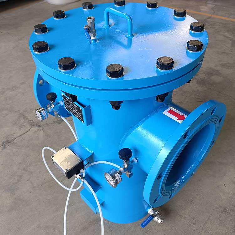 過濾器采用高強度的楔形濾網(wǎng),通過壓差控制、定時控制自動清洗濾芯。當過濾器內(nèi)雜質(zhì)積聚在濾芯表面引起進出口壓差增大到設定值,或定時器達到預置時間時,電動控制箱發(fā)出信號,驅(qū)動反沖洗機構(gòu)。當反沖洗吸盤口與濾芯進口正對時,排污閥打開,此時系統(tǒng)泄壓排水,吸盤與濾芯內(nèi)側(cè)出現(xiàn)一個相對壓力低于濾芯外側(cè)水壓的負壓區(qū),迫使部分凈循環(huán)水從濾芯外側(cè)流入濾芯內(nèi)側(cè),吸附在濾芯內(nèi)內(nèi)壁上的雜質(zhì)微粒隨水流進穣盤內(nèi)并從排污閥排出。特殊設計的濾網(wǎng)使得濾芯內(nèi)部產(chǎn)生噴射效果,任何雜質(zhì)都將被從光滑的內(nèi)壁上沖走。當過濾器進出口壓差恢復正常或定時器設定時間結(jié)束,整個過程中,物料不斷流,反洗耗水量少,實現(xiàn)了連續(xù)化,自動化生產(chǎn)。